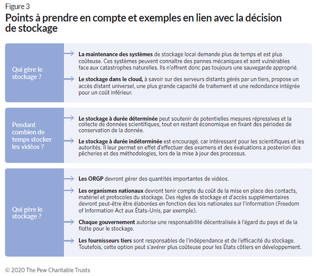 En fonction des objectifs et normes du programme, les images peuvent aller de la vidéo d’un voyage de pêche entier à des vidéos d’événements clés de la pêche (par ex., transbordement). Une fois qu’une séquence vidéo a été examinée, elle peut être supprimée ou stockée pour une durée déterminée ou indéterminée. La Figure 3 répertorie quelques questions et points en lien avec le stockage des données que les créateurs de programmes de surveillance électronique doivent prendre en compte.
