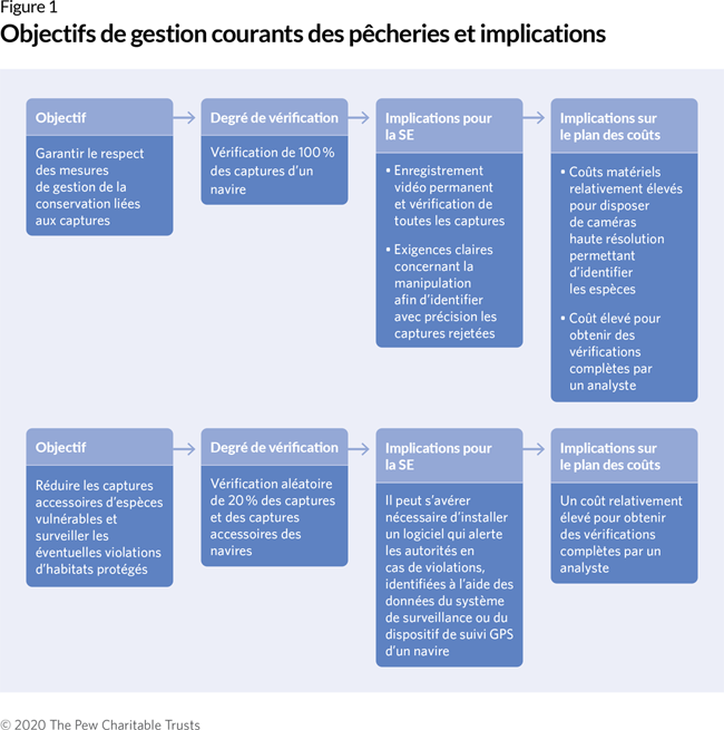 Ces objectifs peuvent inclure la vérification des niveaux de captures visés ou du respect des limites des captures accessoires ainsi que d’autres réglementations de la pêche. Les responsables de pêcheries doivent réfléchir aux difficultés qu’ils rencontrent avec la surveillance, à la manière dont les systèmes de SE peuvent compléter leur système actuel de collecte d’informations, et aux données supplémentaires qui pourraient être collectées de manière économique, efficace et précise à l’aide d’un tel système.