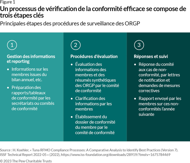 Pour résoudre ce problème, des experts internationaux ont mis au point une boîte à outils qui fournit aux ORGP des stratégies et des conseils pour renforcer et appliquer efficacement leurs processus de vérification et d’amélioration du respect des réglementations.1 La présente fiche d’information détaille les principales recommandations de cette boîte à outils, basées sur les pratiques déjà en cours au sein des ORGP, et les conclusions de trois ateliers d’experts et deux webinaires, organisés en 2020 et 2021 par The Pew Charitable Trusts en collaboration avec l’International Seafood Sustainability Foundation (ISSF – Fondation internationale pour la durabilité des produits de la mer).