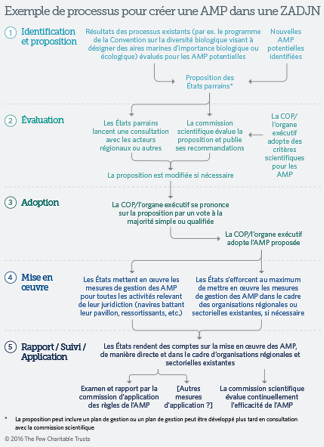 - Un mécanisme qui permette d’identifier et de désigner de possibles AMP en haute mer : Un cadre dans lequel les États peuvent proposer et approuver la désignation d’AMP en haute mer fournirait un moyen d’établir ces AMP.