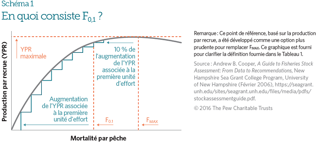 D’autres substituts de FRMD incluent F0,1, la moitié du taux de mortalité naturelle (50 % M), et FMAX, bien que ce dernier surestime fréquemment FRMD et peut donc être risqué. Par exemple, F0,1 est utilisé par les scientifiques de la Commission Internationale pour la Conservation des Thonidés de l’Atlantique (CICTA) en tant que point de référence de remplacement pour FRMD pour le stock oriental de thon rouge de l’Atlantique. Une analyse des points de référence candidats pour ce stock a établi que F0,1 constituait le meilleur substitut pour FRMD, tandis que F40 % était également fiable.19 F30 % et FMAX étaient plus subjectifs et s’avéraient être moins précis, de sorte que les scientifiques de la CICTA ne les ont pas considérés comme des substituts adéquats.
