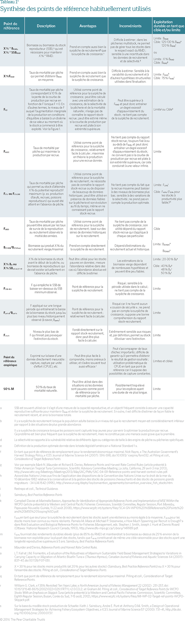 - David J. Die et John F. Caddy, « Sustainable Yield Indicators From Biomass: Are There Appropriate Reference Points for Use in Tropical Fisheries? » Fisheries Research 32 (1997) : 69–79, doi:10.1016/S0165-7836(97)00029-5; Wendy L. Gabriel et Pamela M. Mace, « A Review of Biological Reference Points in the Context of the Precautionary Approach, » Proceedings, 5th NMFS NSAW, NOAA Technical Memorandum NMFS-F/SPO-40 (1999), https://www.st.nmfs.noaa.gov/Assets/stock/documents/workshops/nsaw_5/gabriel_.pdf; Andre E. Punt et Anthony D.M. Smith, « The Gospel of Maximum Sustainable Yield in Fisheries Management: Birth, Crucifixion and Reincarnation, » dans Conservation of Exploited Species, ed. John D. Reynolds et coll. (New York : Cambridge University Press, 2001) ; Sainsbury, Best Practice Reference Points ; et Davies and Basson, Approaches for Identification of Appropriate Reference Points.
