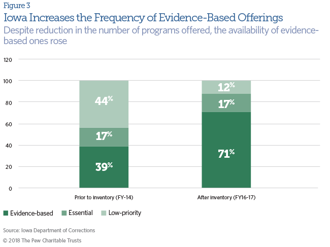 Through its partnership with the Pew-MacArthur Results First Initiative, the Iowa Department of Corrections conducted an inventory of its current programs, collected data on their design and capacity, and used rigorous research studies to categorize programs by the likelihood that they will reduce recidivism.