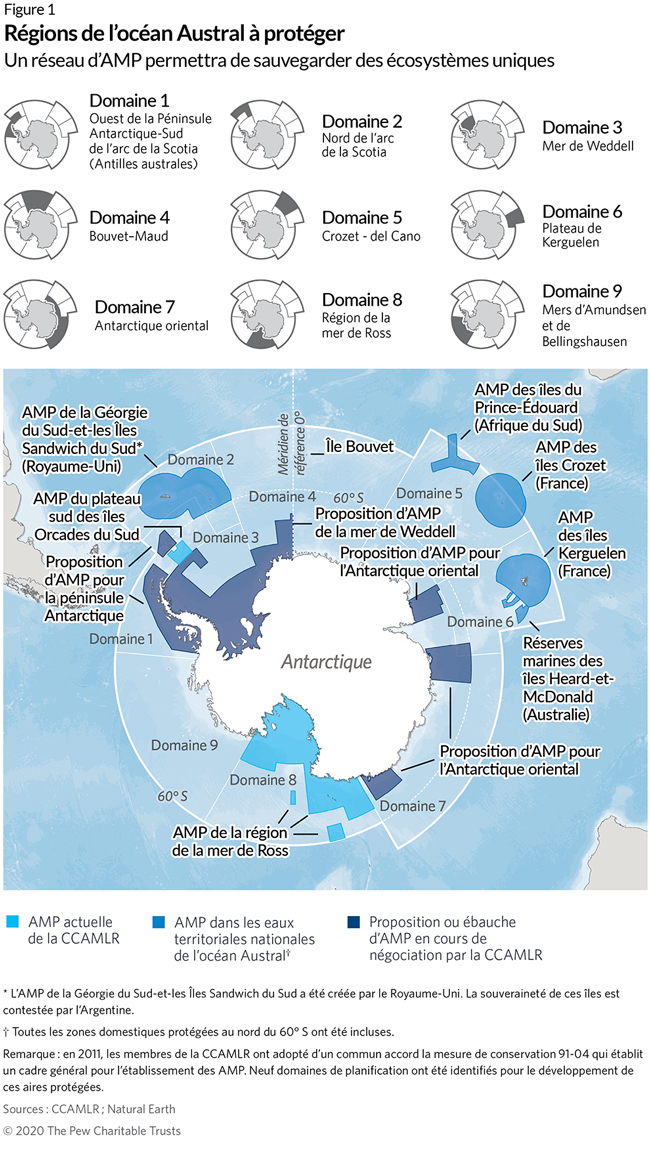 Le domaine 9 de planification des AMP de la CCAMLR (mers de Bellingshausen et d’Amundsen) est la seule zone de l’océan Austral qui ne comprend pas d’AMP désignée ou proposée. Par ailleurs, la protection des régions situées entre les AMP nationales des domaines 4, 5 et 6 pourrait être renforcée par une AMP de la CCAMLR qui augmenterait la connectivité entre ces habitats essentiels.