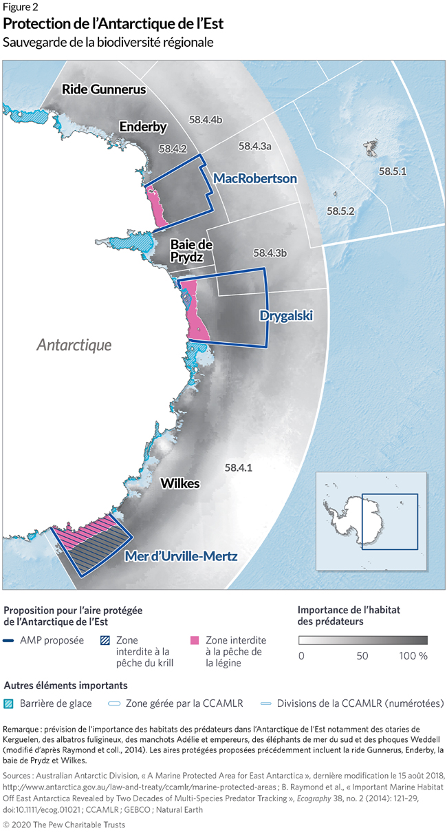 - Australian Antarctic Division, “A Marine Protected Area for East Antarctica,” last modified Aug. 15, 2018, http://www.antarctica.gov.au/law-and-treaty/ccamlr/marine-protected-areas; B. Raymond et al., “Important Marine Habitat Off East Antarctica Revealed by Two Decades of Multi-Species Predator Tracking,” Ecography 38, no. 2 (2014): 121–29, doi:10.1111/ecog.01021.