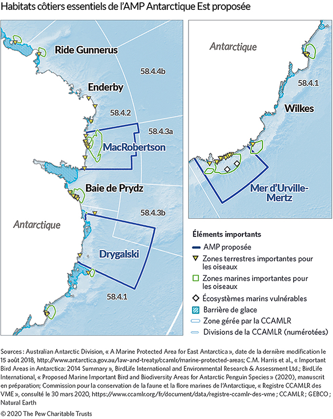 L’aire marine protégée proposée pour l’Antarctique oriental permettrait de préserver 970 000 kilomètres carrés d’océan dans les régions de MacRobertson, Drygalski et de la mer d’Urville-Mertz17. Les courants côtiers, dont le gyre de la baie de Prydz, se mêlent au courant circumpolaire antarctique, ce qui favorise une vie marine abondante dans tout l’océan Austral18. Les manchots, les phoques, le krill et la légine sont parmi les nombreuses espèces qui dépendent de cet habitat relativement inexploré, froid et isolé pour leur survie19.
