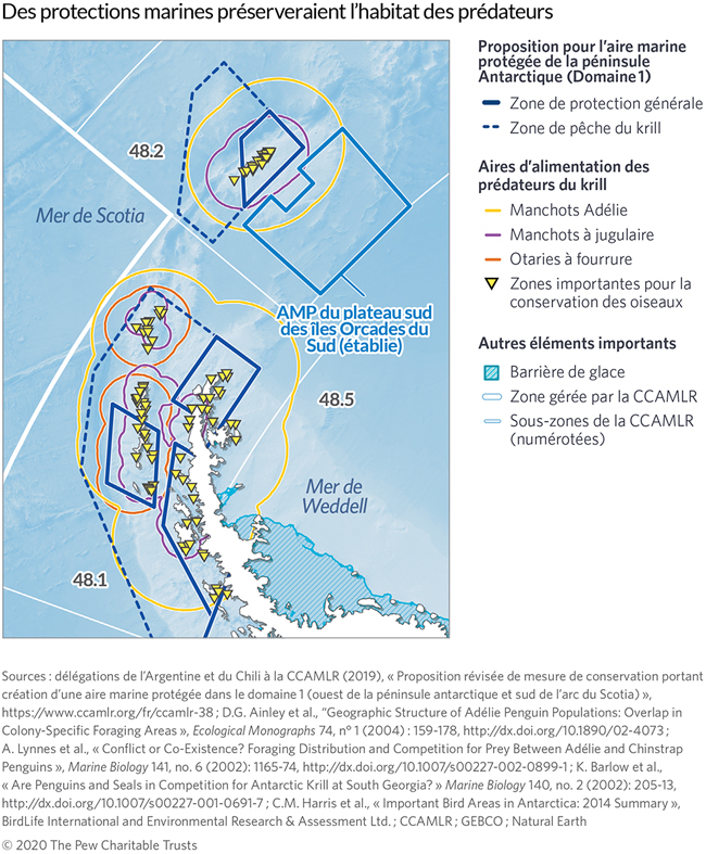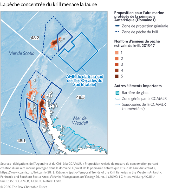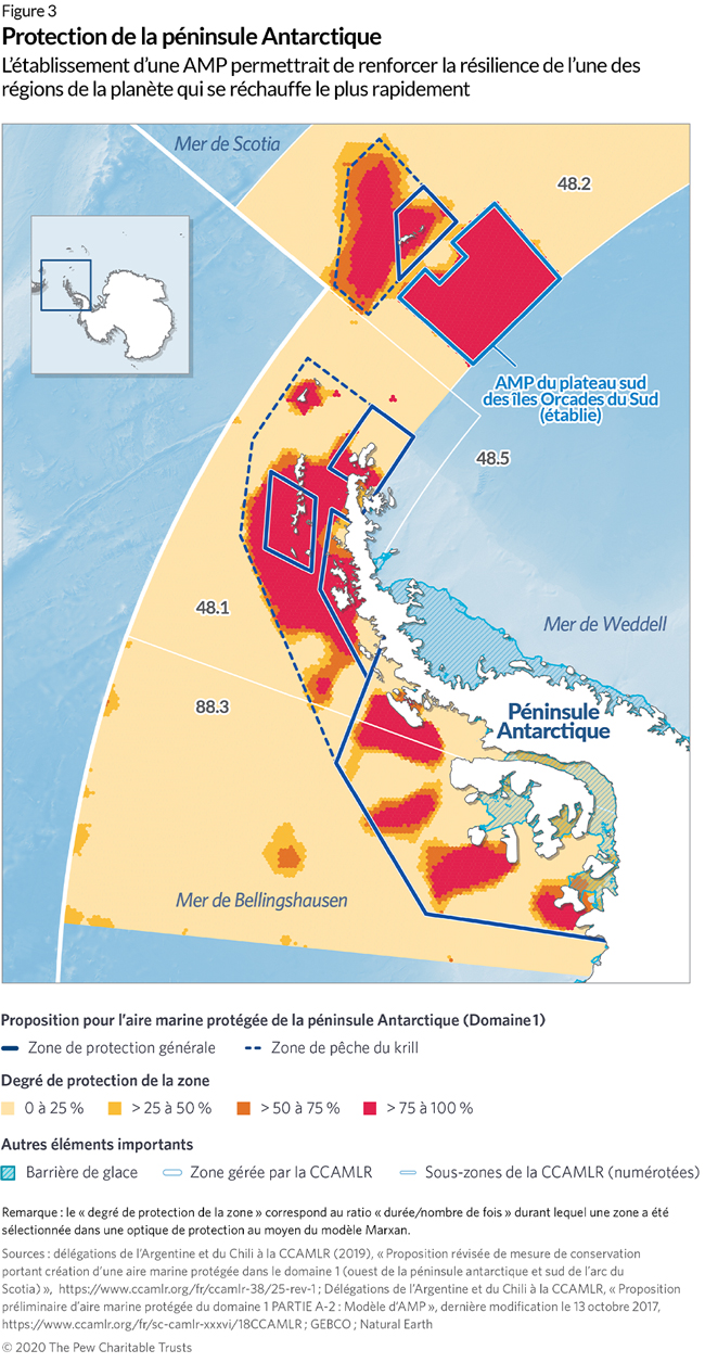 La proposition d’aire marine protégée de la péninsule Antarctique (domaine 1) comprend une zone de protection générale27 qui couvre deux zones biologiquement riches : les détroits de Bransfield et de Gerlache. Elle interdirait la pêche au krill dans les zones d’alimentation côtières des prédateurs de l’Antarctique. Elle vise également à protéger une partie de la mer de Bellingshausen, une importante zone de frai et de croissance pour le krill, ainsi que d’autres zones écologiquement importantes pour des espèces de poissons à valeur commerciale. La zone de pêche du krill autoriserait la pêche commerciale du krill pour les nations membres, gérée dans le cadre des mesures de conservation de la CCAMLR. La CCAMLR s’efforce de mettre en œuvre une gestion des pêches respectueuse des écosystèmes dans cette région, afin d’assurer la survie à long terme de la pêche et de protéger la diversité des animaux qui dépendent du krill de l’Antarctique.