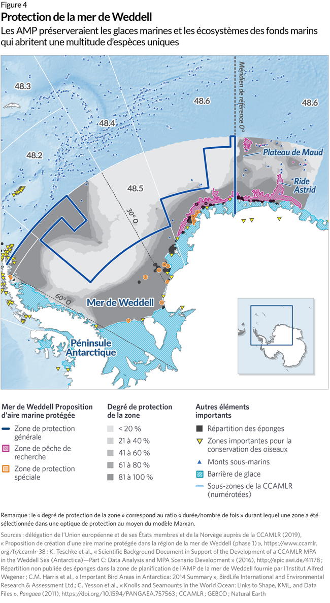 - Delegation of the European Union and its Member States and Norway to CCAMLR (2019), “Proposal to Establish a Marine Protected Area Across the Weddell Sea Region (Phase 1),” https://www.ccamlr.org/en/ccamlr-38; K. Teschke et al., “Scientific Background Document in Support of the Development of a CCAMLR MPA in the Weddell Sea (Antarctica)—Part C: Data Analysis and MPA Scenario Development” (2016), http://epic.awi.de/41178; unpublished sponge distribution in Weddell Sea MPA planning area provided by the Alfred Wegener Institute; C.M. Harris et al., “Important Bird Areas in Antarctica: 2014 Summary,” BirdLife International and Environmental Research & Assessment Ltd.; C. Yesson et al., “Knolls and Seamounts in the World Ocean: Links to Shape, KML, and Data Files,” Pangaea (2011), https://doi.org/10.1594/PANGAEA.757563.