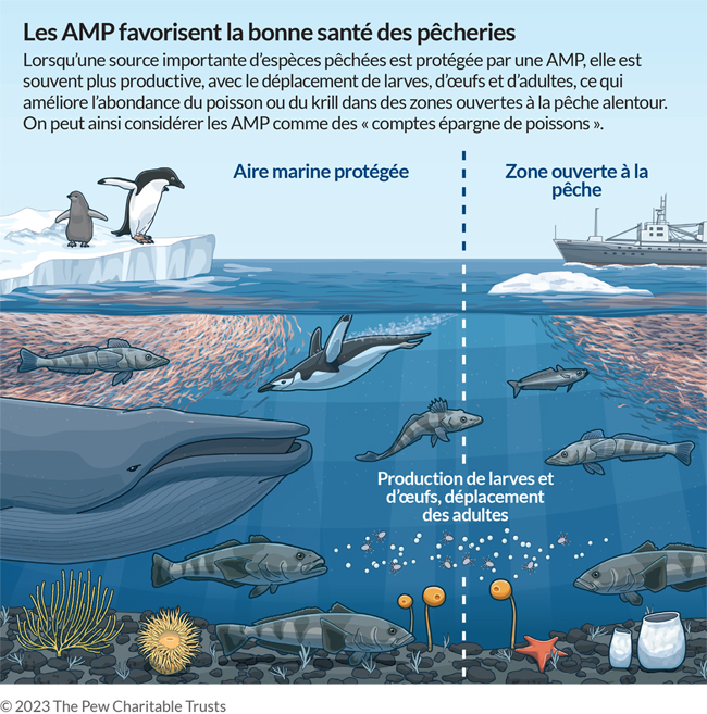 D’après l’Organisation des Nations unies pour l’alimentation et l’agriculture, plus d’un tiers des stocks de poissons du monde sont victimes de surpêche7. Les données scientifiques montrent qu’en plus de préserver et reconstituer les habitats et la biodiversité, les AMP et les mesures de gestion écosystémique de la pêche sont aussi positives pour la pêche, notamment en assurant des populations satisfaisantes des espèces pêchées8. L’explication de ces avantages réside dans la mise en place d’un effet d’entraînement : les espèces pêchées dans les aires entièrement ou fortement protégées sont plus susceptibles de se déplacer au stade adulte ou larvaire à l’extérieur des zones protégées et viennent dynamiser les populations alentour dans une mesure suffisante pour maintenir ou accroître la pêche9.
