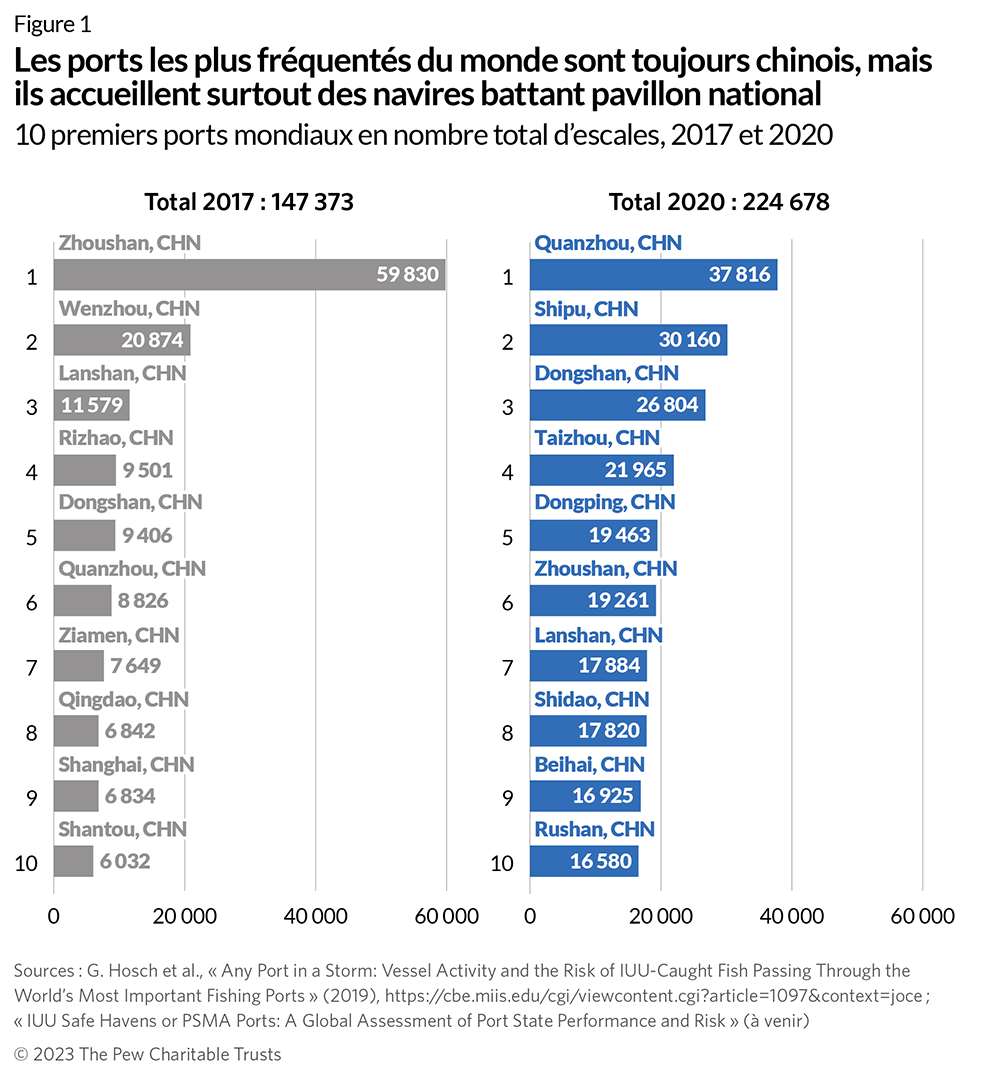 En 2020, comme en 2017, les 10 premiers ports accueillant le plus de navires de pêche et de transport étaient tous chinois, les navires nationaux représentant la majorité des débarquements (cf. figure 1). Toutefois, entre 2017 et 2020, les ports utilisés en Chine ont changé, et la fréquentation totale des navires a augmenté de 50 %, très probablement en raison de l’amélioration des algorithmes de détection des signaux AIS, et de l’exploitation par les chercheurs de données AIS provenant d’un autre fournisseur possédant davantage de données côtières.
