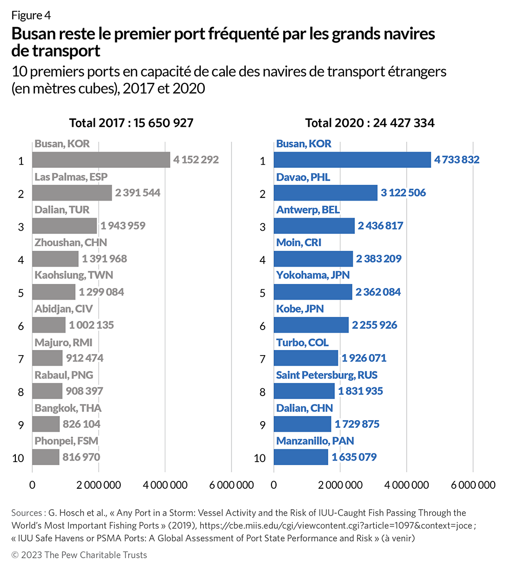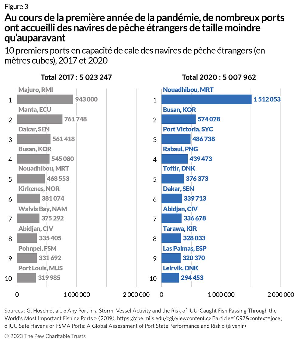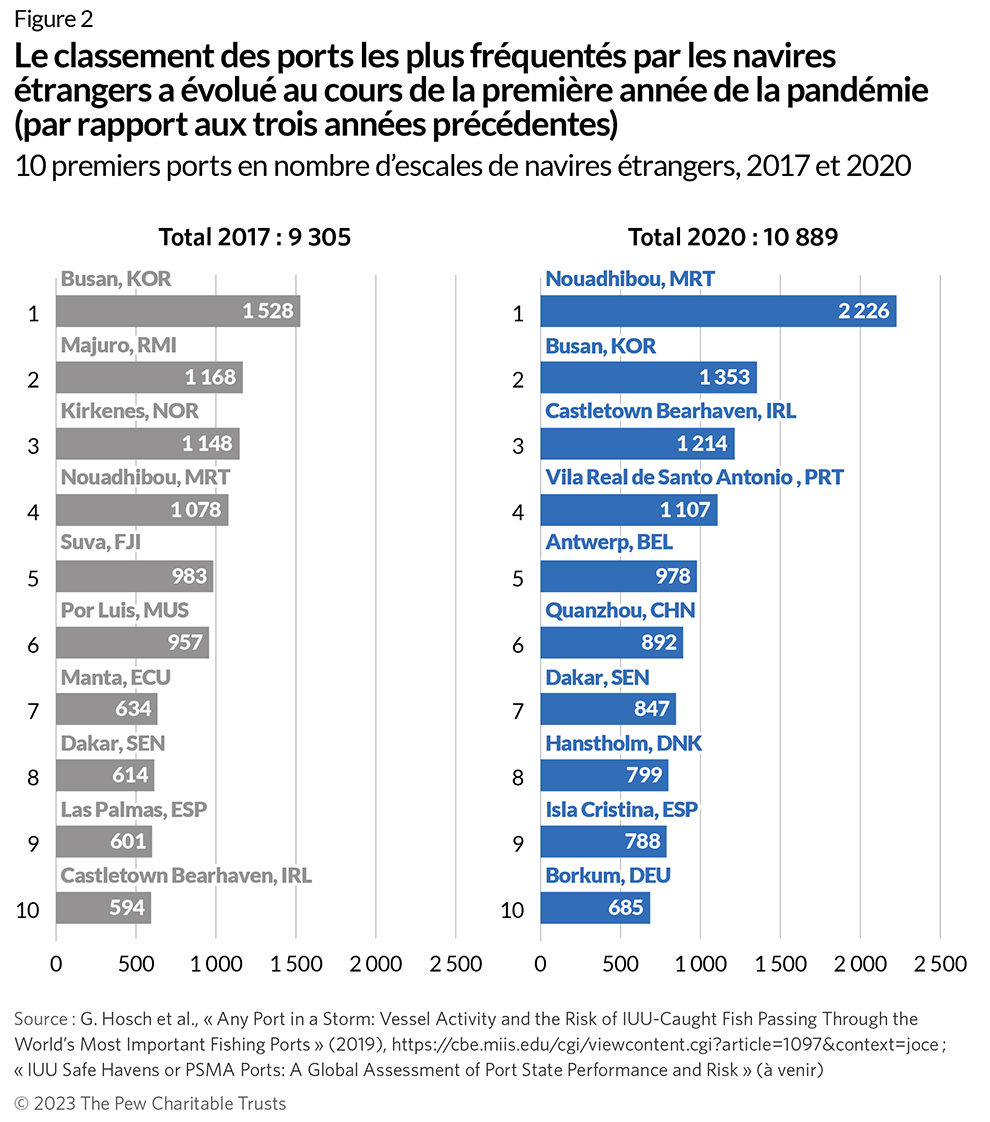 Selon cette analyse, le nombre total d’escales de navires étrangers a augmenté depuis la première étude, et le classement des ports visités a sensiblement évolué (cf. figure 2). Par exemple, le port de Nouadhibou, en Mauritanie, a vu sa fréquentation par des navires étrangers augmenter de plus de 100 %, le faisant ainsi passer de la quatrième place en 2017 à la première en 2020. Les bateaux de pêche étrangers accueillis à Nouadhibou battaient en majorité pavillon turc (930 escales), chinois (299), espagnol (293) et camerounais (183). Le port de Busan, en République de Corée, a perdu la tête du classement et occupe désormais la deuxième place, avec un recul d’un peu plus de 10 % ; sa fréquentation est majoritairement constituée de bateaux de pêche et de transport russes (837 escales), chinois (178) et panaméens (146).