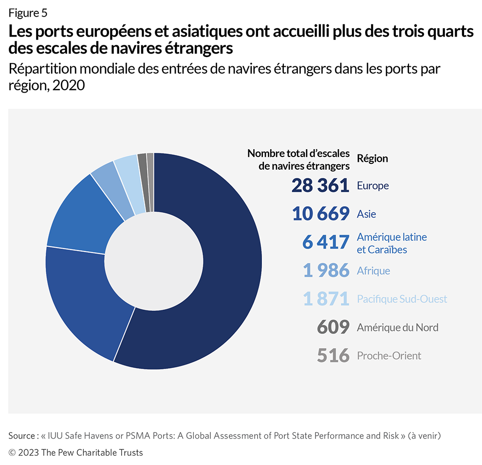 Globalement, les ports européens ont été les plus fréquentés par des navires étrangers, la plupart d’entre eux provenant d’autres pays de l’UE. Les ports d’Asie, d’Amérique latine et des Caraïbes arrivent respectivement en deuxième et en troisième position en matière de fréquentation (cf. figure 5). Les autres régions représentent moins de 10 % de l’ensemble des escales de navires étrangers.