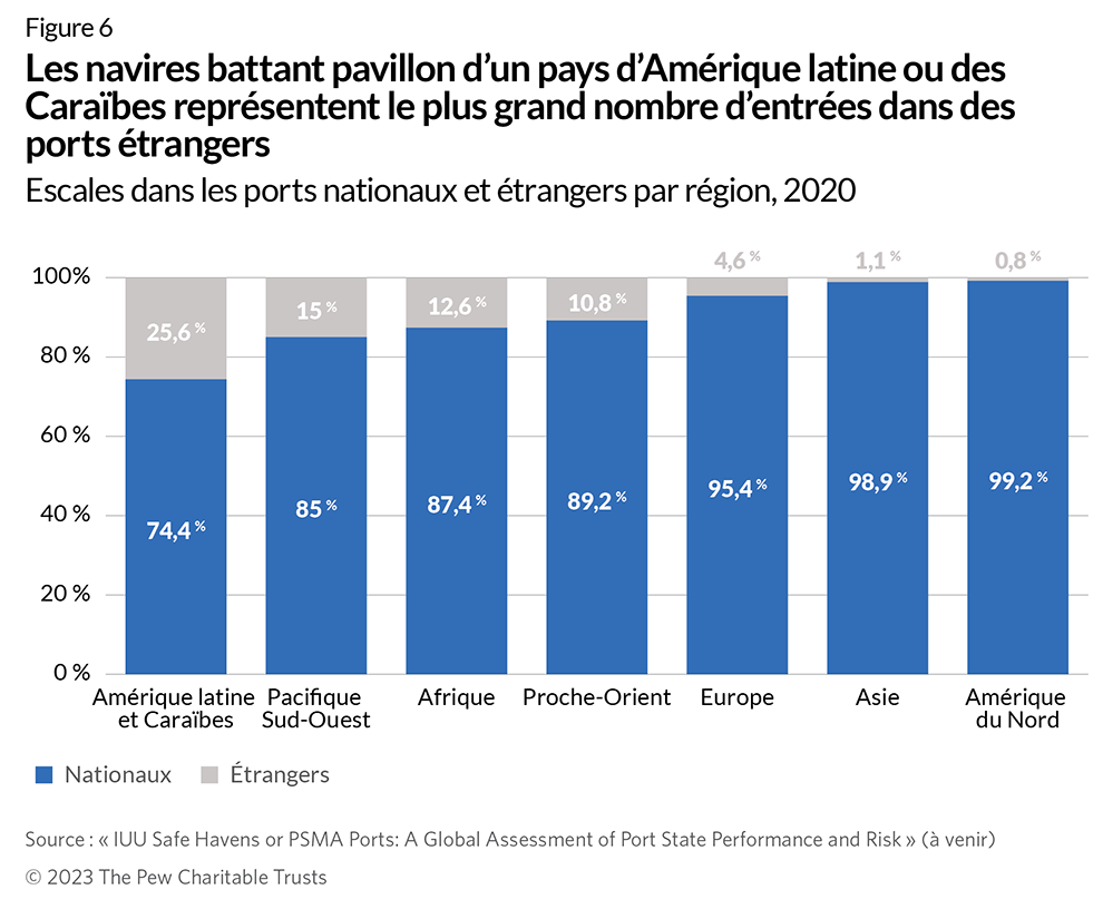 Les navires d’Amérique latine et des Caraïbes (25,6 %) ont effectué le plus grand nombre d’escales dans des ports étrangers, suivis par ceux du Pacifique Sud-Ouest (15 %), de l’Afrique (12,6 %), du Proche-Orient (10,8 %) et de l’Europe (4,6 %) (cf. figure 6). Les navires asiatiques (1,1 %) et nord-américains (0,8 %) ont majoritairement fréquenté leurs ports nationaux.