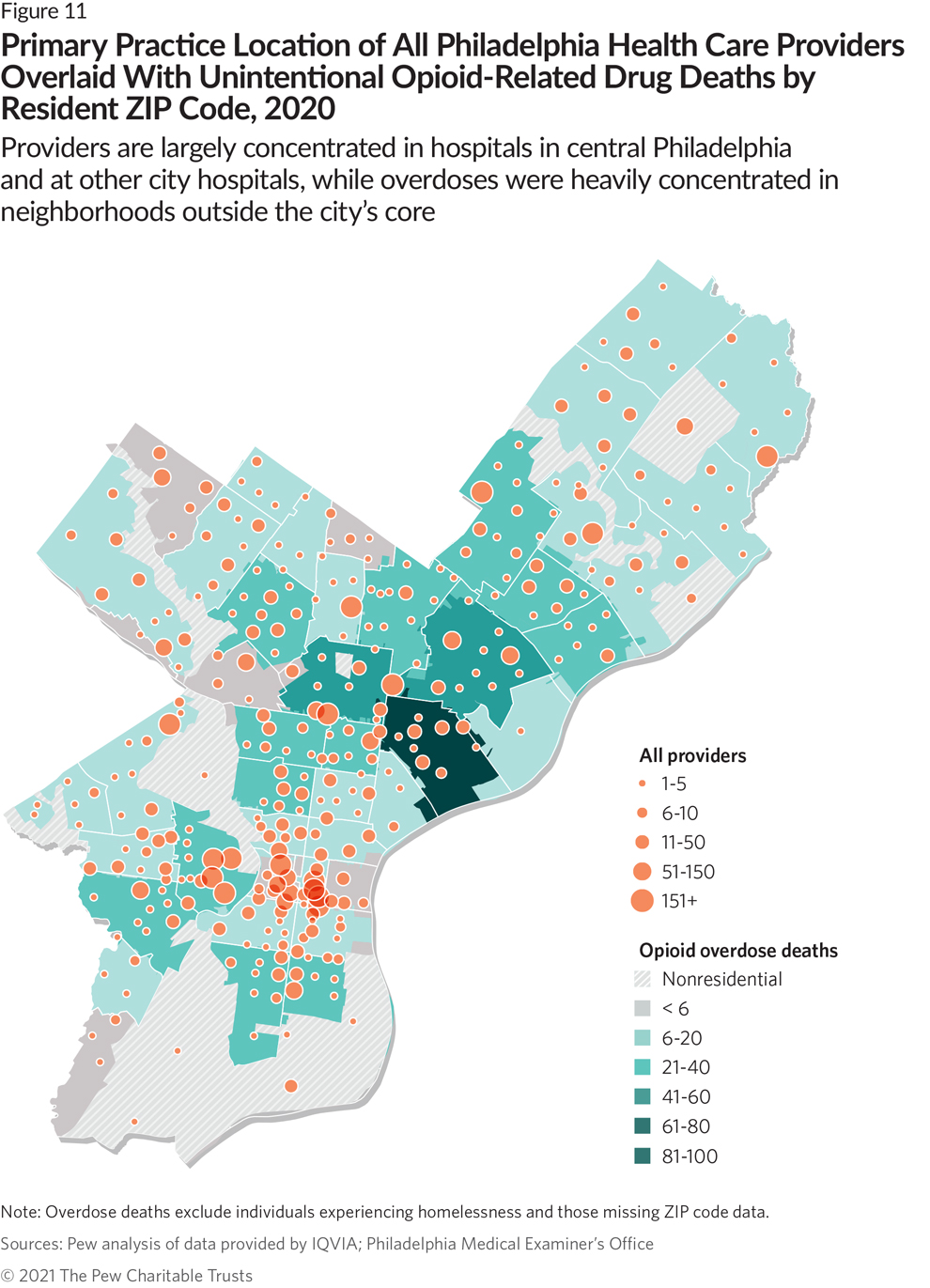 The opioid overdose crisis in Philadelphia is highly concentrated in some neighborhoods. The largest numbers of city residents who overdosed in 2020 lived in Kensington, in other neighborhoods in Lower North and Lower Northeast Philadelphia, and in South Philadelphia and West Philadelphia. (There is a strong general overlap between where overdose victims live and where overdoses occur.)21 But how well does the location of OUD providers match those in need of treatment?