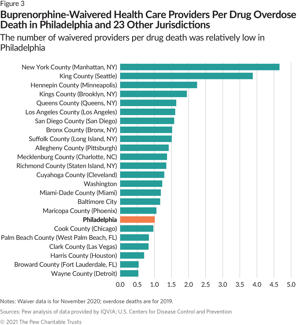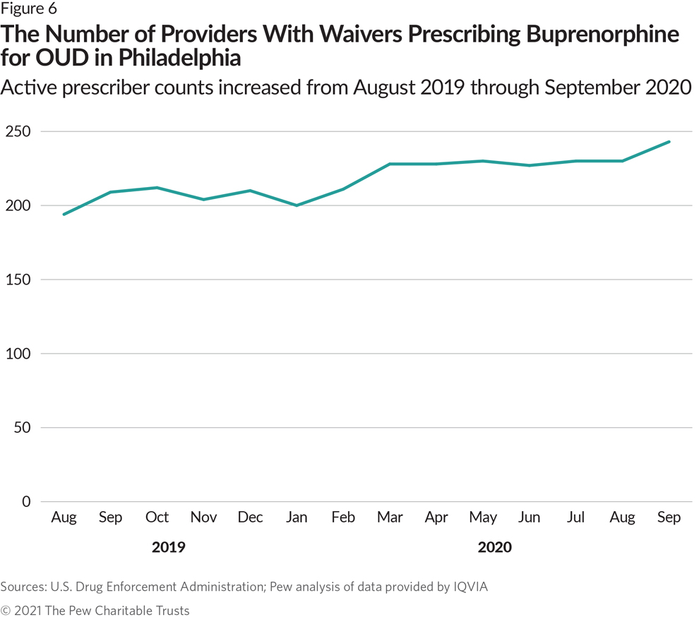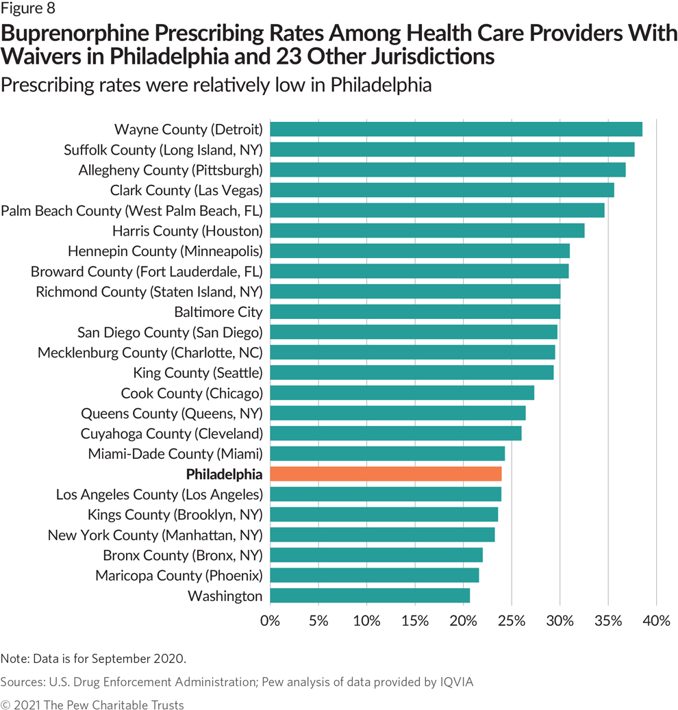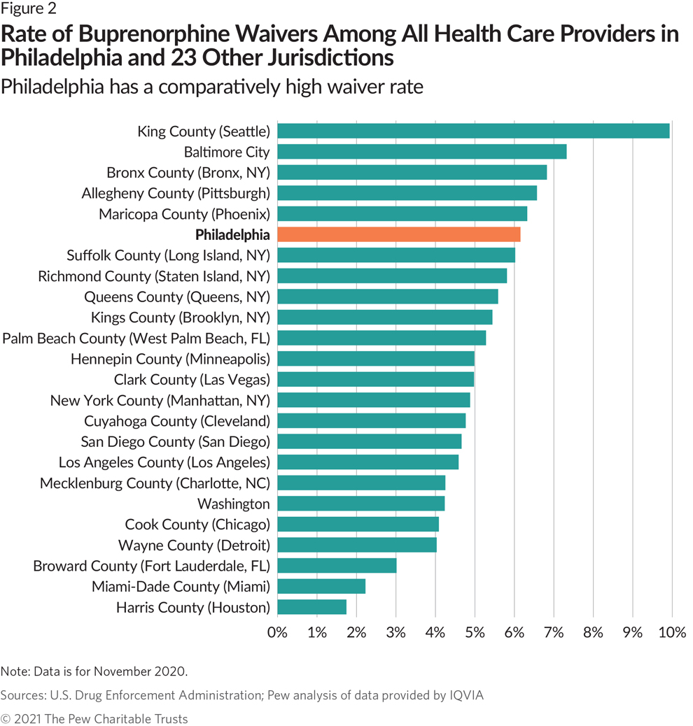 - Roughly 6% of Philadelphia’s health care providers had waivers allowing them to prescribe buprenorphine for OUD as of November 2020, with the number climbing steadily and at a faster pace than in many other large urban cities and counties with high rates of opioid overdose deaths. The 6% figure was relatively high among the 24 jurisdictions in this comparison but low measured against the need for treatment—as quantified by the number of drug overdose deaths in each city or county.
