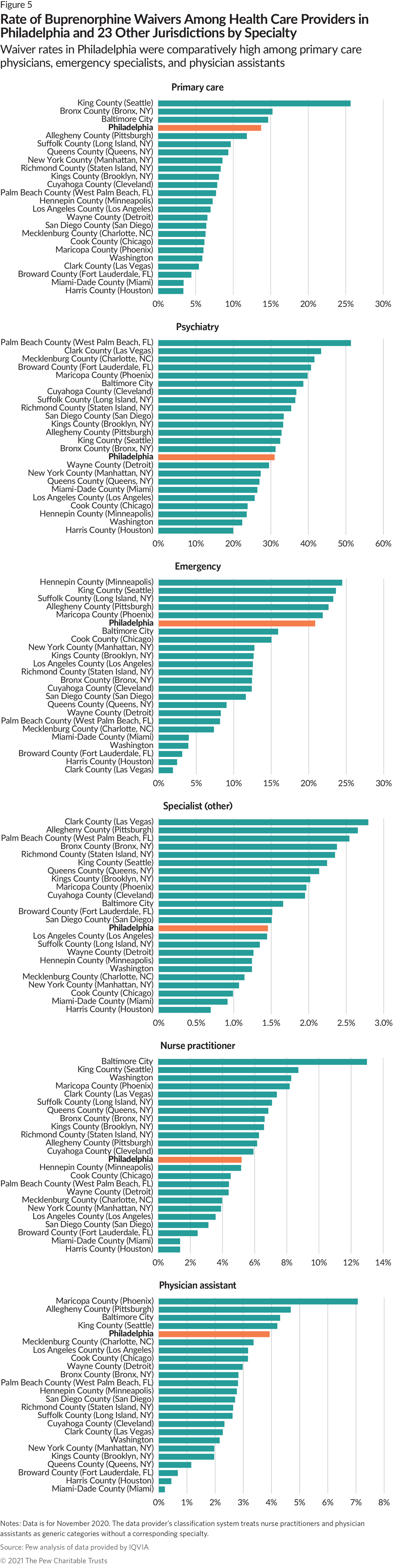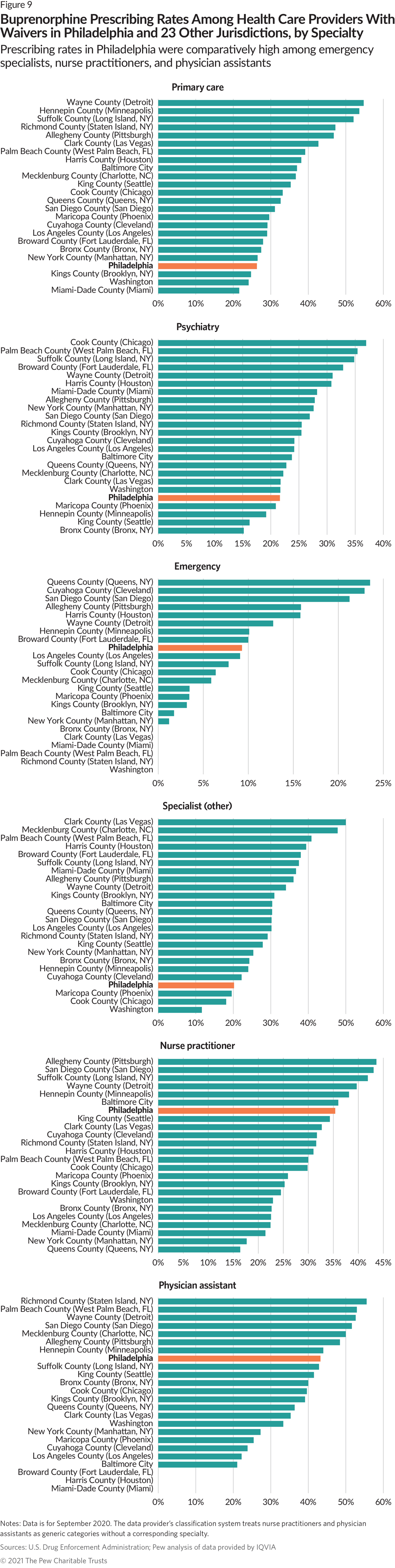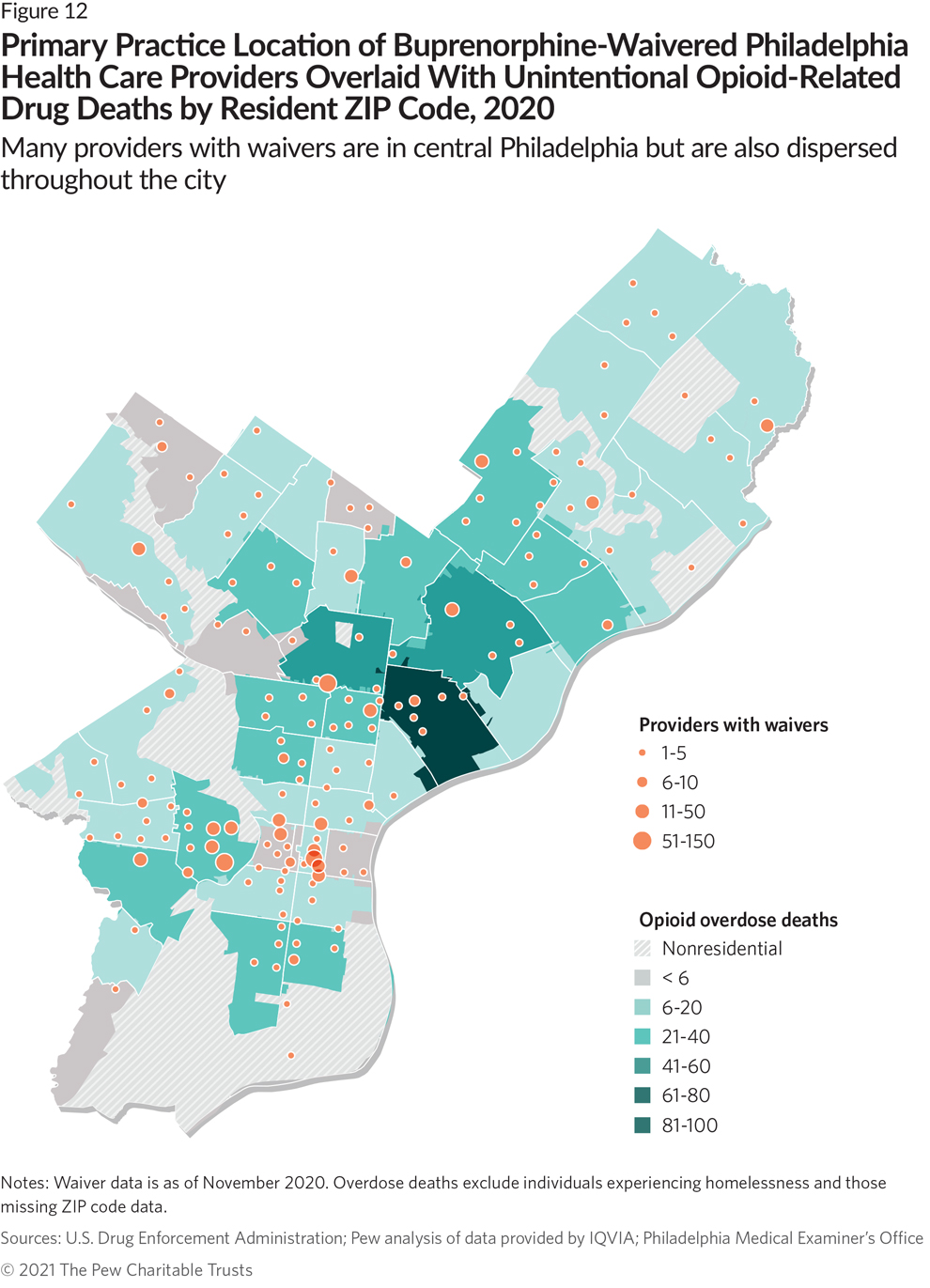 - Roughly 6% of Philadelphia’s health care providers had waivers allowing them to prescribe buprenorphine for OUD as of November 2020, with the number climbing steadily and at a faster pace than in many other large urban cities and counties with high rates of opioid overdose deaths. The 6% figure was relatively high among the 24 jurisdictions in this comparison but low measured against the need for treatment—as quantified by the number of drug overdose deaths in each city or county.
