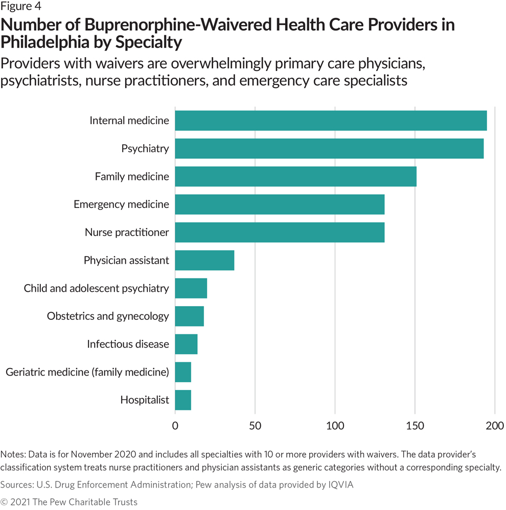 As the data indicates, obtaining a waiver alone does not ensure that a provider will prescribe buprenorphine. That depends on many of the same factors that deter providers from getting waivers in the first place. Pew is looking at these and other possible explanations in ongoing qualitative research with care providers in Philadelphia.