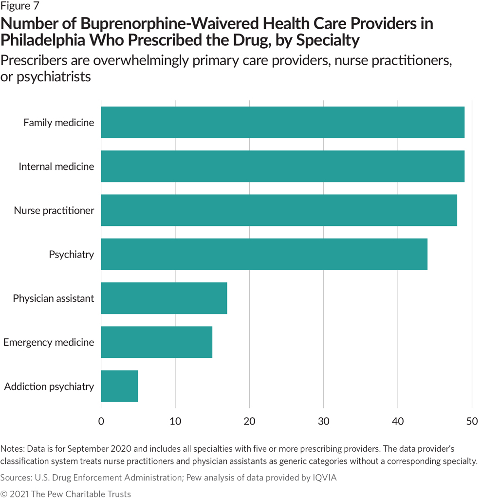 - N. Logan, government relations specialist, Pennsylvania State Nurses Association, email to The Pew Charitable Trusts, June 2021; Pennsylvania Society of Physician Assistants, “Summary of PA Regulations,” accessed June 3, 2021, https://pspa.net/career-center/resources/summary-of-pa-regulations/; National Association of Clinical Nurse Specialists, “Scope of Practice,” accessed June 15, 2021, https://nacns.org/advocacy-policy/policies-affecting-cnss/scope-of-practice/; Pennsylvania Coalition of Nurse Practitioners, “Scope of Practice,” accessed June 3, 2021, https://www.pacnp.org/page/ScopeofPractice. Clinical nurse specialists, certified registered nurse anesthetists, and certified nurse midwives are also eligible for the federal X-waiver but were not included in this study. Of those, only certified nurse midwives can prescribe medication in Pennsylvania, but prescribing restrictions there effectively prevent them from participating in this program.