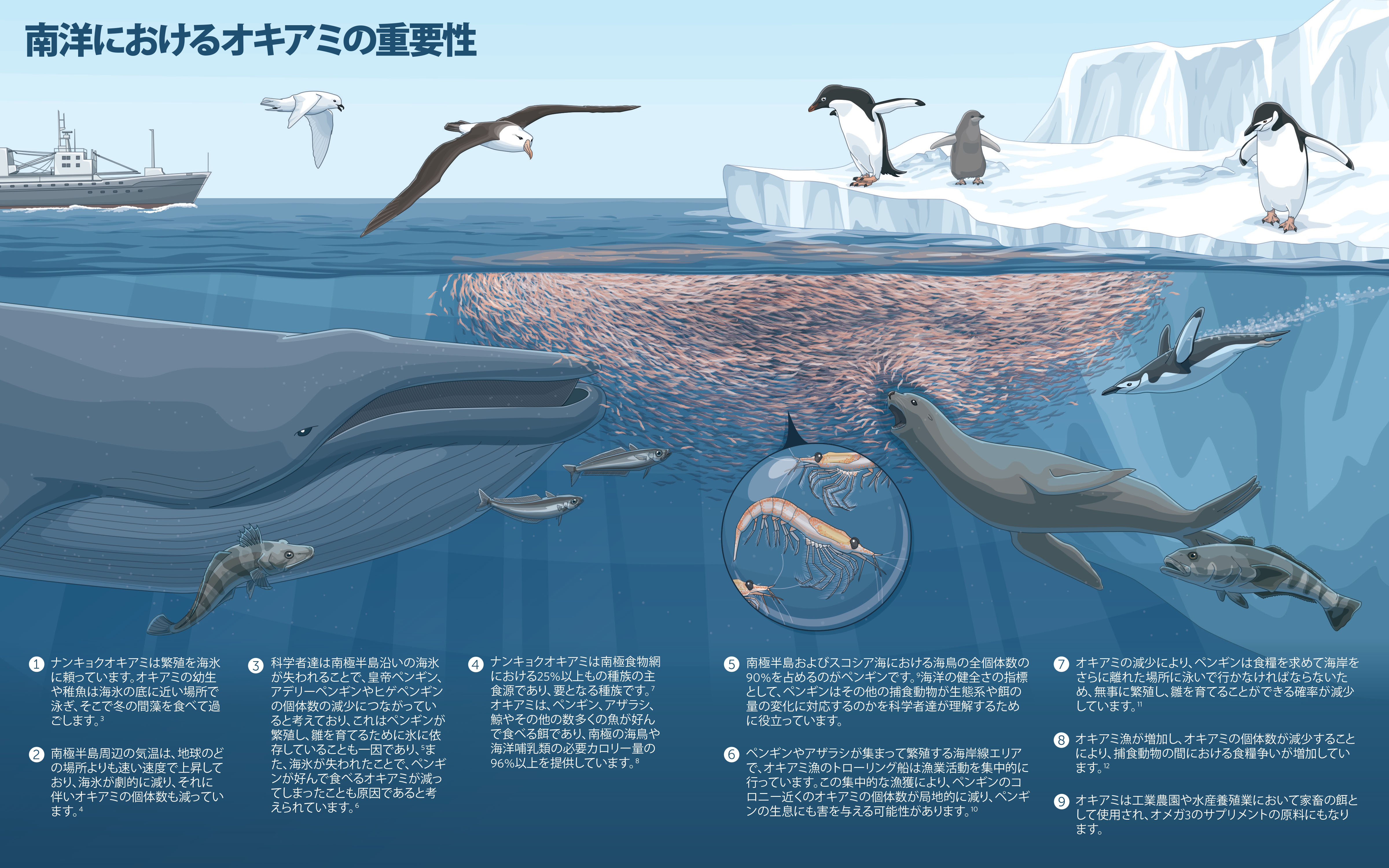 オキアミは大量に生息しています。実際に、科学者はナンキョクオキアミの総重量は地球上のどんなその他の 動物の総重量よりも多いと考えています。しかしながら、集中漁業と気候変動の相乗効果により、特に南極半島 海岸に生息するオキアミの生息数が減少し、ヒゲペンギンやアデリーペンギンといった様なオキアミを餌とす る動物にマイナスの影響があり、1 南極の食物網全体にも波及効果をもたらしています。