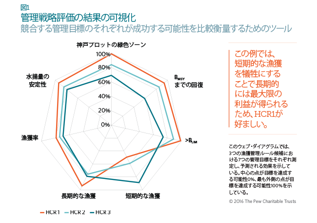 管理目標の中には他の管理目標と二律背反的関係にあるものもある。例えば、漁獲量を最大限にすることと資源が管理基準値を下回る可能性を最小限にすることは互いに相反している。このような場合、管理者は各目標の重要性をよく検討し、最終的な漁獲管理ルールの選択において比較検討を行う必要がでてこよう。漁業は多くの人に食糧、雇用、経済的利益をもたらす一方、こうした利益はその資源の生産性と健全性が保たれて初めて得られるものでもある。したがって、「資源状態」及び「安全性」に関する管理目的を達成できる確率が十分高くなるよう、管理目標の重み付けが行われる必要がある。その他の管理目標は「資源状態」及び「安全性」に関する管理目標を損なうようなことがあってはならない。ウェブ・ダイアグラム(放射グラフ、多基準レーダーチャート、クモの巣図とも呼ばれる)によってMSEプロセスで考慮すべきトレードオフの関係を表すことができる。(図1を参照。)