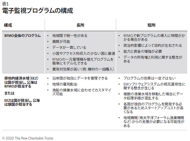 人間の監視担当者は海上で漁業データを収集することによって、管理者が監視を改善するために重要な役割を果たしています。ほとんどのRFMOでは一元管理型の監視プログラム、または各国のプログラムや準地域的なプログラムを用意しています。現在運用中のモデルは、将来のEMプログラムの構成方法を大きく左右する可能性があります。表1では3種類のプログラムモデルのメリットとデメリットをまとめています。
