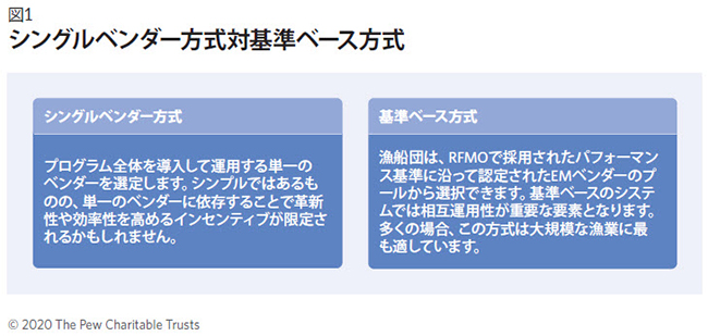 プログラムの構成に合意があれば、RFMOでEMベンダー1社と契約するか、合意済みの基準に基づいて数社の ベンダーと契約するか決定するのにも役立ちます。(図1を参照。)