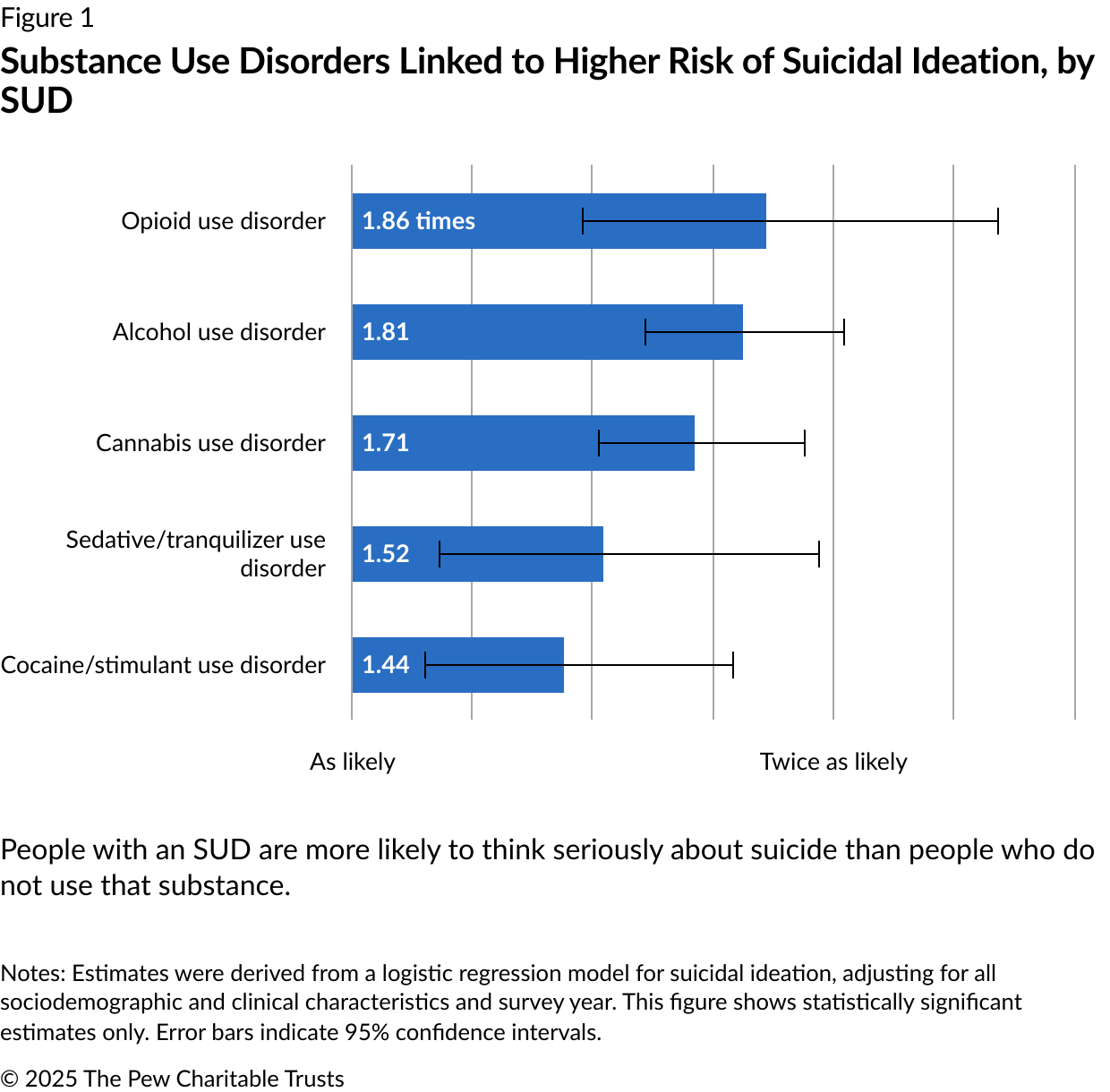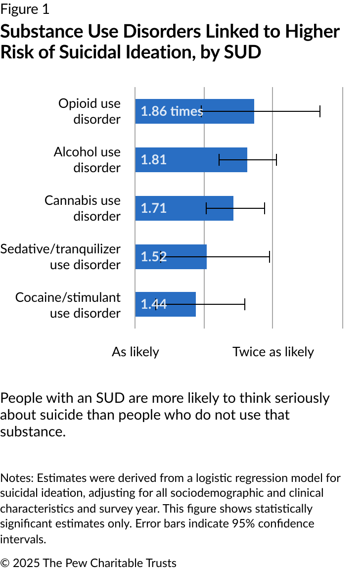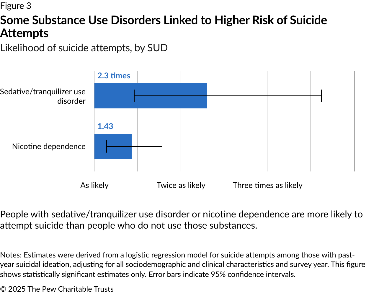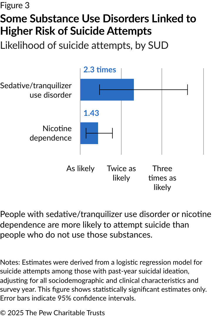 To shed light on these dynamics, Dr. Hillary Samples and The Pew Charitable Trusts conducted research, published as “National Trends and Disparities in Suicidal Ideation, Attempts, and Health Care Utilization Among U.S. Adults.”5 They found that substance use and SUD increase the odds that adults think seriously about and attempt suicide, which is consistent with studies that link SUD with increased risk of suicide deaths.