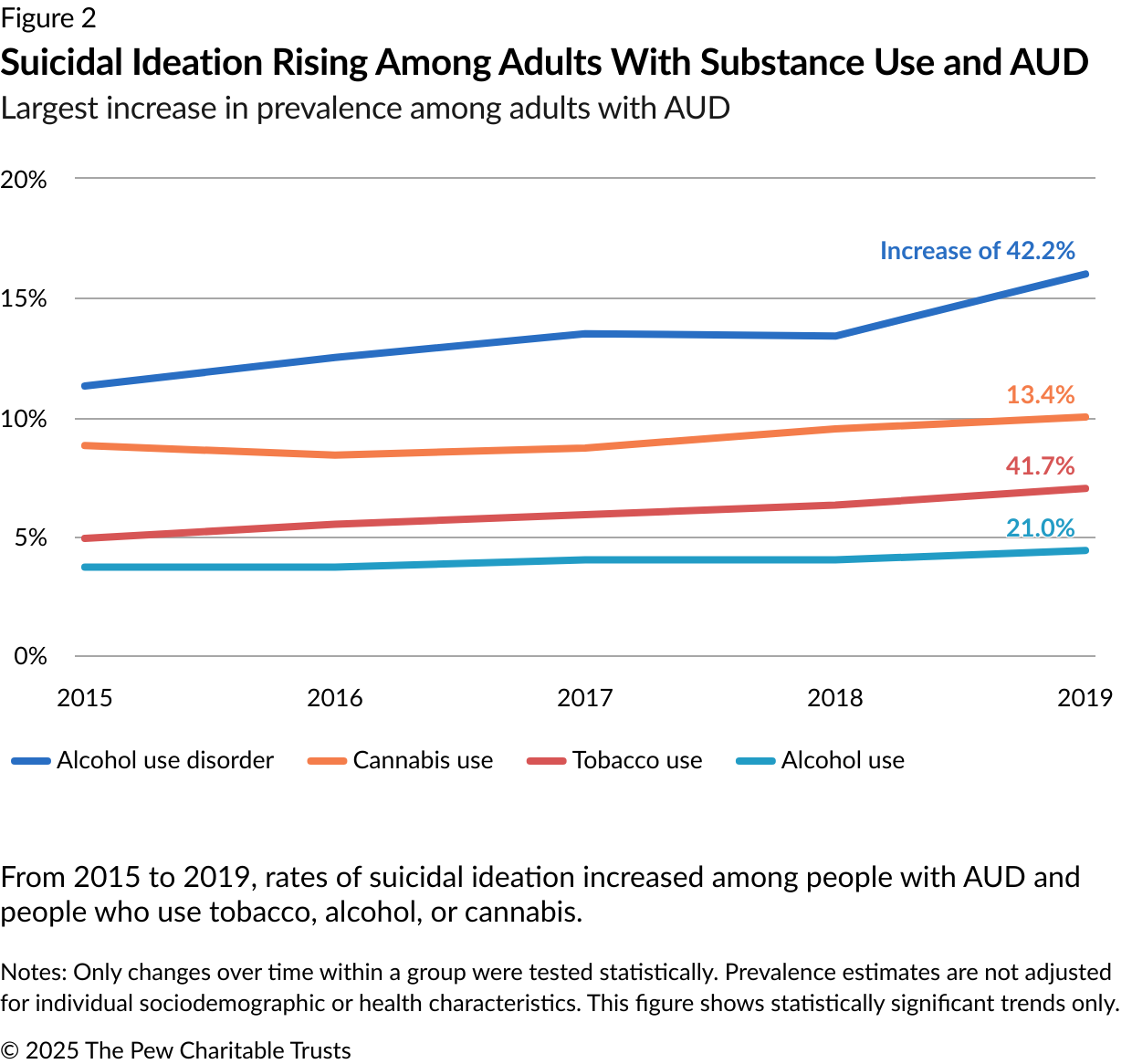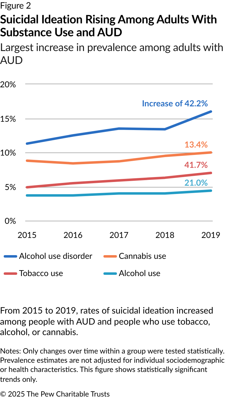 • The prevalence of suicidal ideation rose among adults with AUD and those who use alcohol, tobacco, or cannabis.