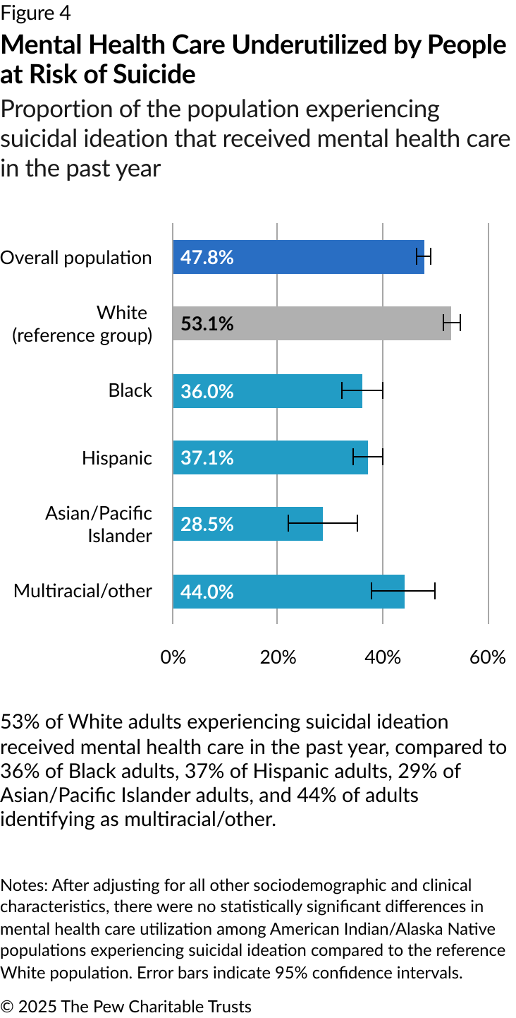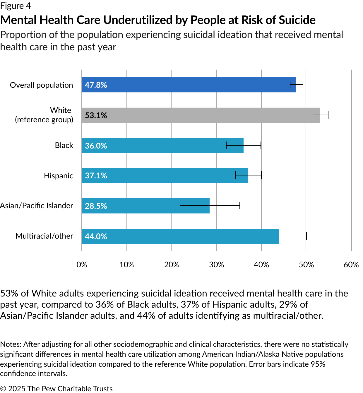 For people who thought seriously about suicide, 87% had received general health care within the past year, but only 48% received mental health care. Black, Hispanic, Asian/Pacific Islander, and multiracial adults accessed mental health care less often than White adults. Members of some racial and ethnic groups who thought seriously about suicide were less likely to receive mental health care than White adults, yet they were more likely or increasingly likely to attempt suicide.