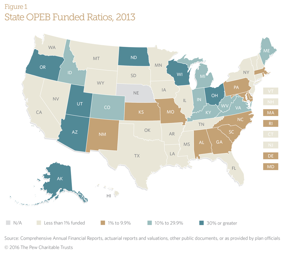 Pew aggregated data to get one value for each state’s OPEB liabilities and assets. By dividing the value of plan assets by the total liability, Pew arrived at each state’s OPEB funded ratio.