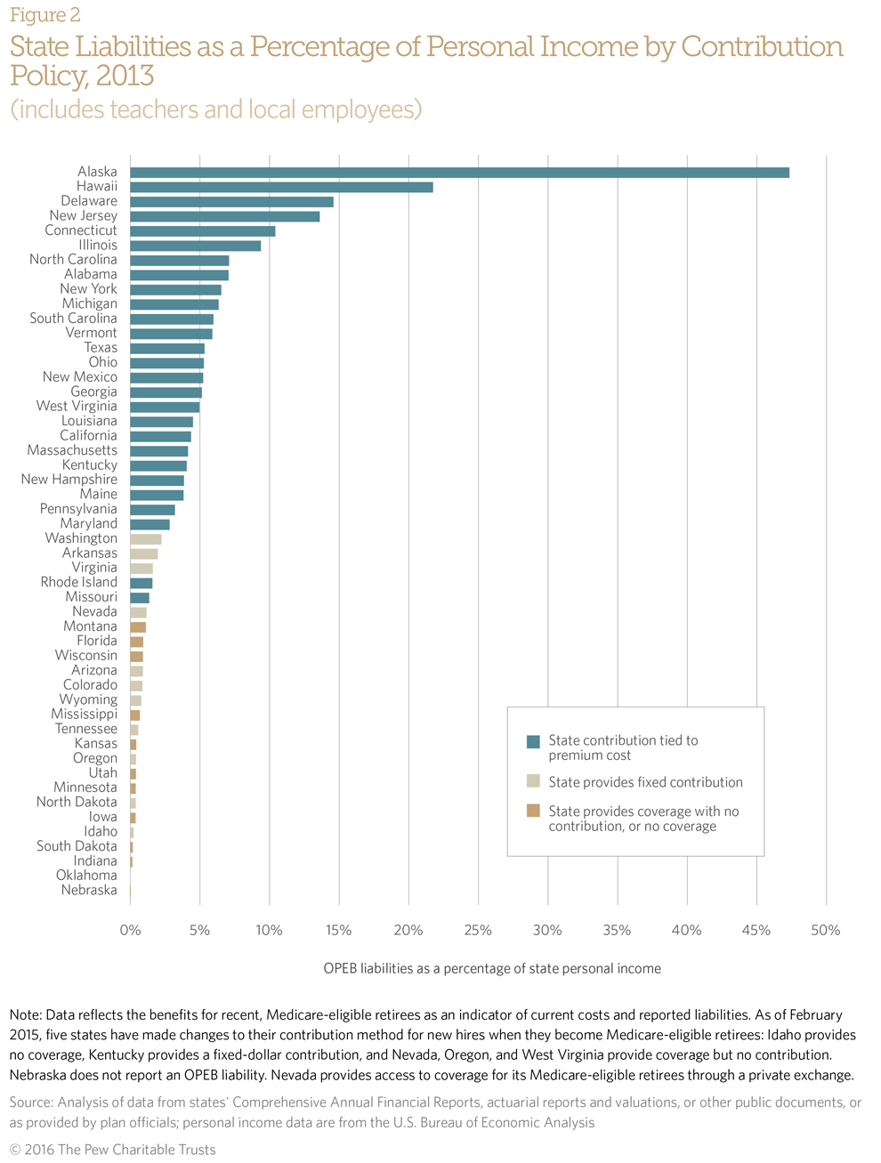 Pew compared states’ 2013 OPEB liabilities to 2013 state personal income to show these liabilities in relation to the potential resources states have on hand to pay for these costs. Although the research indicates significant overall reported OPEB liabilities, the relative size varies widely among states (Figure 2). OPEB liabilities range from zero percent of personal income in Oklahoma and Nebraska to 22 percent in Hawaii and 47 percent in Alaska.