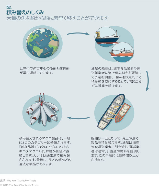 積み替えは、魚介製品、特に「刺身品質」のマグロを迅速に市場に出すための効果的かつ効率的な方法とな り得ます。しかし、これらの活動が適切に監視または規制されていないと、悪質な業者が不正な報告をしたり、違法漁獲量を不正に書き換えたりするなどの違法行為を行うことがあります。積み替えの監視は、次の3つの 主要分野で改善する必要があります。