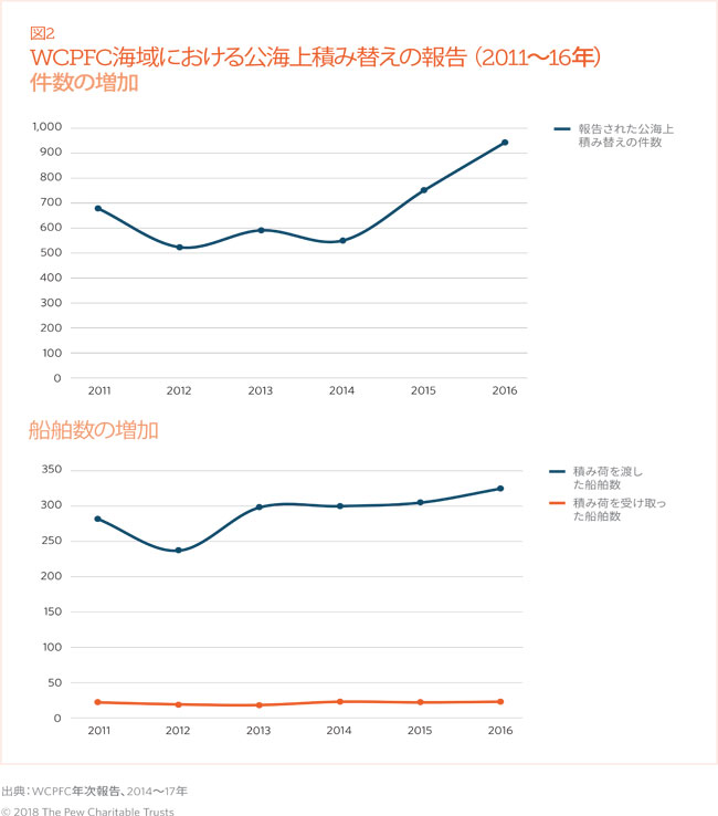 このような取り組みにもかかわらず、過去6年間で、海上での積み替えの回数や関与する漁船の数は増加しています。このような行為は例外ではなく一般的なものになっています。