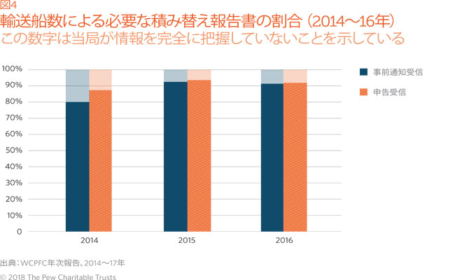- 報告。積み替え行為については、紙ベースの報告が依然として標準的です。これらの報告が当局に届くまで に時間がかかるため、その情報に関して何ヶ月も対処できない可能性があります。時間がかかることにより、潜在的な問題の特定および阻止が困難になることがあります。