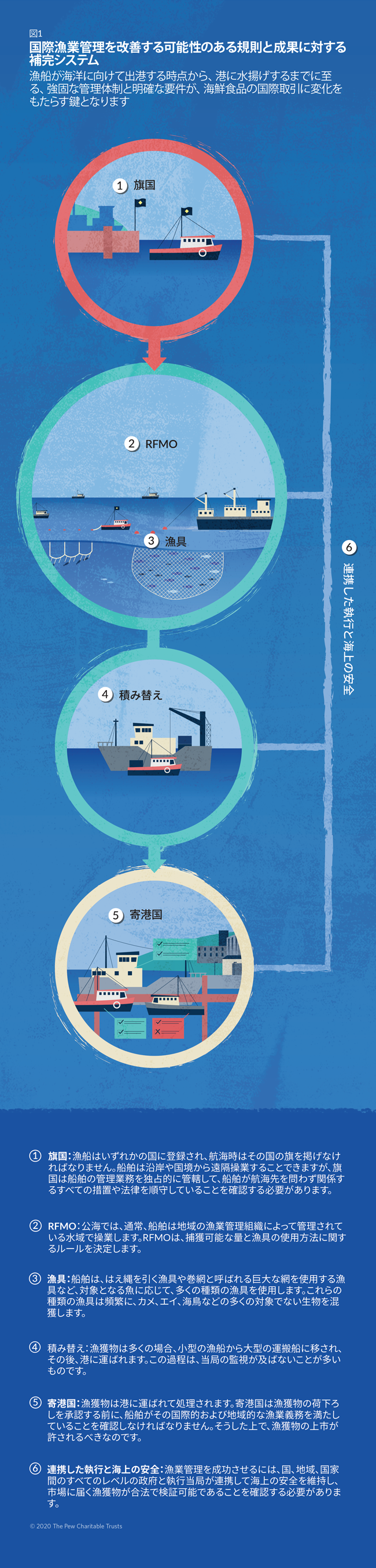 漁業活動に関する規定と管理には大きな隔たりがあるものの、旗国、沿岸国、寄港国、商業国のいずれかであ る関係諸国政府による様々な対応策が、漁獲活動を規制する管理体制の強化と国際基準の向上を目的として、 既に実施されています。国際的な合意と条約は、各旗国が実施する個別の対応策との相乗効果によって、海洋 と漁場の健全性に多大な影響をもたらすことがあります。