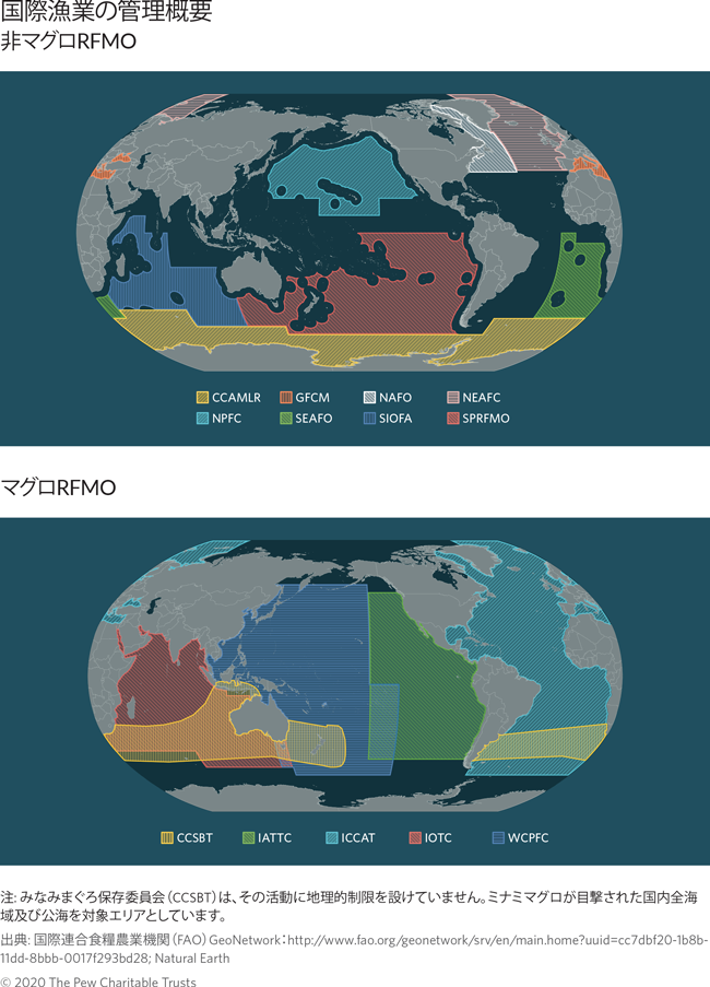 商業的重要性の高い魚類の多くは、食料を求めて海洋を移動します。移動経路は複数の国の法域にまたがり、 公海まで達します。つまり、魚種資源管理が可能な海域もあれば、漁船に狙われやすい海域も含まれている ということです。これらの魚をどれだけ、誰によって、どのように、いつ漁獲できるかという事柄についての 規則は、国内法令及び規制の組み合わせや、地域漁業管理機関(RFMO)により定められています。RFMOは、 特定海域における魚種資源の管理と保存に関して実用的及び/又は財務的利害関係を共有し、その資源の 管理を協力のもと行うことに合意した複数の政府から構成される国際団体です。