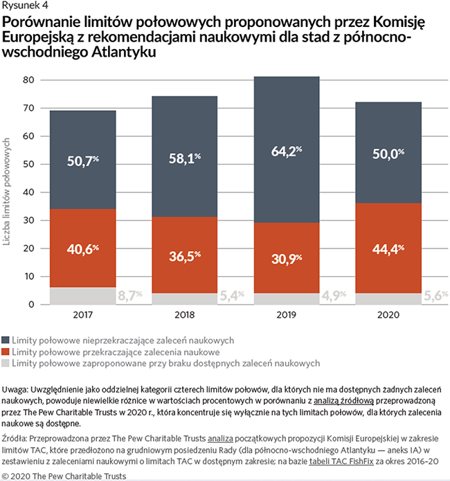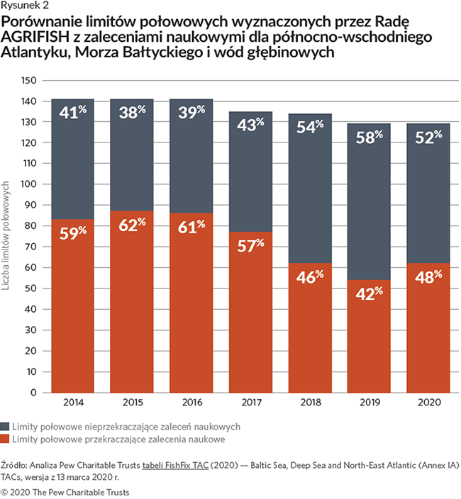 Od czasu wejścia w życie zreformowanej WPRyb w 2014 r. The Pew Charitable Trusts co roku porównuje decyzje5 ministrów rybołówstwa w zakresie limitów połowowych na północno-wschodnim Atlantyku z dostępnymi rekomendacjami naukowymi. Mimo że udział limitów przekraczających zalecenia naukowe spadł w ostatnich latach, UE nie dotrzymała wyznaczonego w WPRyb terminu zakończenia przełowienia do 2020 r. W rzeczywistości więcej limitów połowowych ustalonych na 2020 r. przekraczało doradztwo naukowe niż w 2019 r. (48% w porównaniu z 42%).