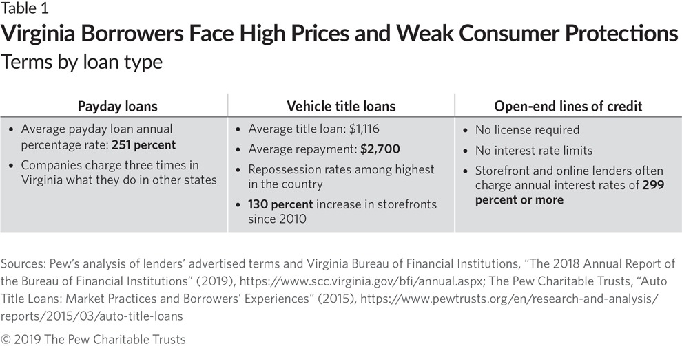 - Virginia Bureau of Financial Institutions, “The 2018 Annual Report”; websites of open-end credit lenders reviewed in August 2019. Analysis by The Pew Charitable Trusts.