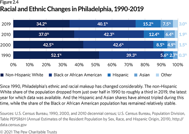And in recent years, the city’s population has become increasingly diverse. As of 2019, 40% of Philadelphians were Black or African American, 34% non-Hispanic White, 15% Hispanic or Latino, and 8% Asian.