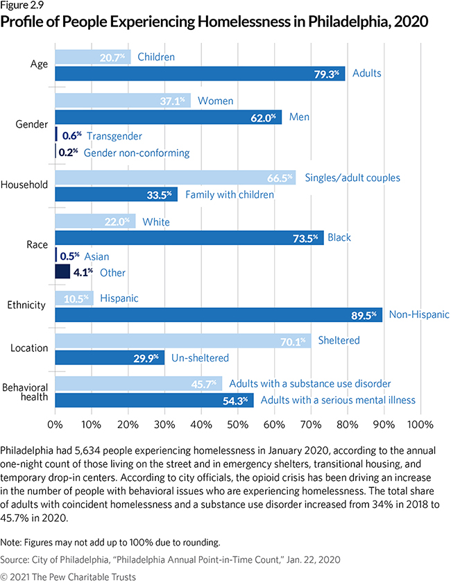 The pandemic affected virtually every aspect of Philadelphians’ lives—including their economic, educational, social, physical, and emotional well-being—magnifying existing inequities and exposing new fault lines. As documented in a poll by The Pew Charitable Trusts last summer, Black and Hispanic residents of Philadelphia were two and three times more likely than White residents, respectively, to lose jobs and income, and to know someone who died from the coronavirus. The factors underlying such disparities were central to the movement for racial equity and social justice that grew nationally and locally after George Floyd was killed in May by police in Minneapolis.