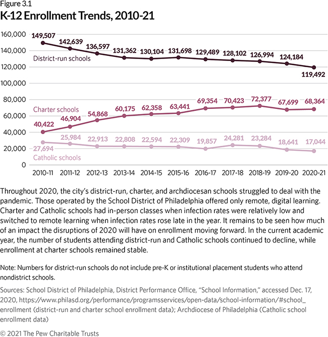 Given the situation, the lasting significance of enrollment figures for the 2020-21 academic year was difficult to assess. Schools run by the School District of Philadelphia recorded their biggest drop in student population since 2013-14. Numbers were also down in the Catholic schools but up slightly for charters.