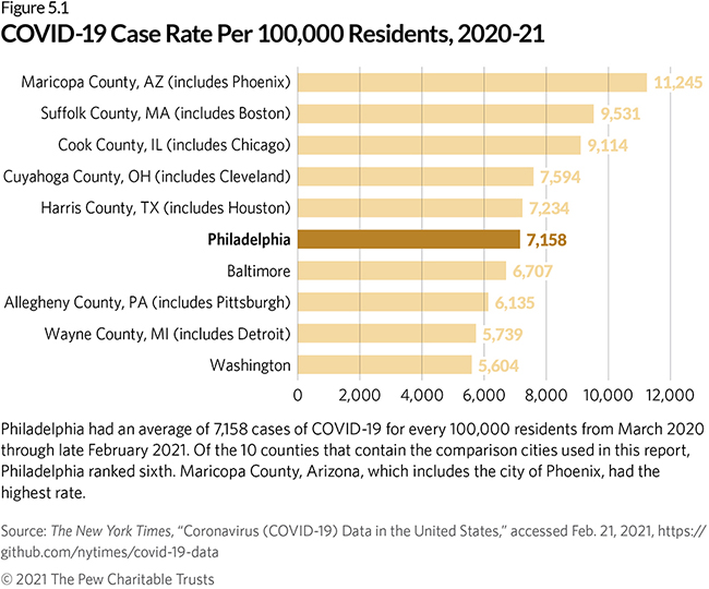 During the year, nearly 2,500 Philadelphia residents died from the virus—the death toll surpassed 3,000 in February 2021—and more than 96,000 tested positive. To lower transmission rates, the city started requiring people to wear masks in June and reported that a majority complied with that mandate in both indoor and outdoor settings in the final months of 2020.