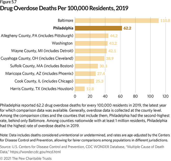 In addition to COVID-19, Philadelphians also contended with major health concerns that were present prior to the pandemic. One was opioids. In 2020, an estimated 1,200 fatal overdoses occurred in the city, near 2017’s record high and the fourth straight year in which the number exceeded 1,100. And Black Philadelphians continued to have higher rates of chronic conditions, lower life expectancy, and higher infant mortality rates than White residents.