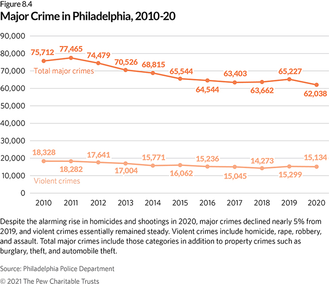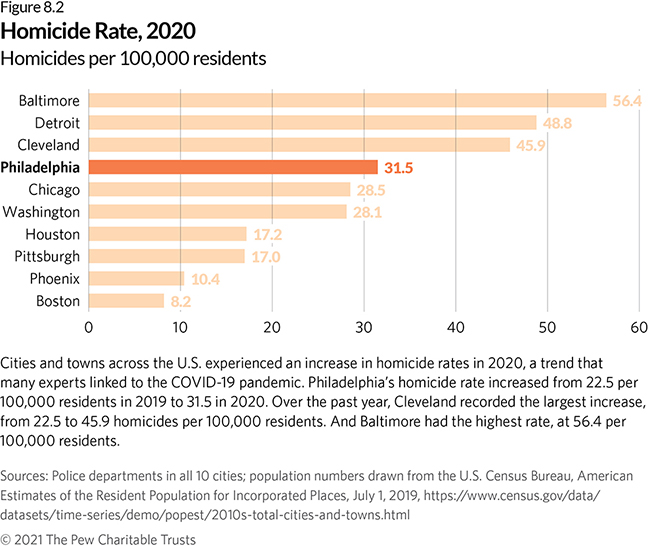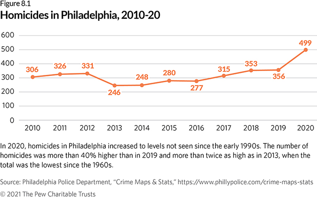 In 2020, Philadelphia had 499 homicides—the most since the early 1990s—up 40% from the previous year and more than twice the historic low recorded in 2013.
