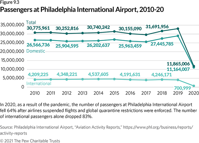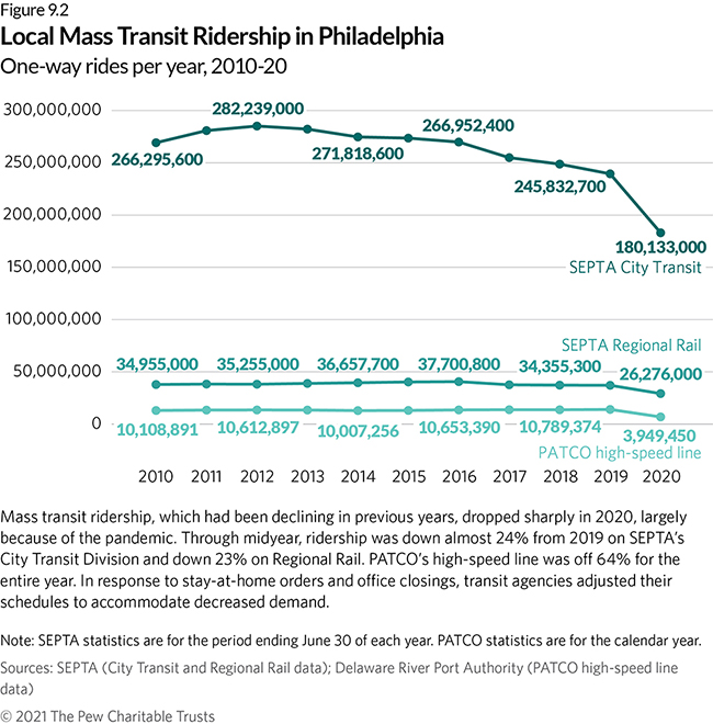 Local mass transit use dropped sharply in 2020; through the 12 months ending June 30—which included only the first few months of the pandemic restrictions—ridership on SEPTA’s City Transit Division was down almost 24% from the prior year. Use of PATCO’s high-speed line declined more than 60% for the entire year. Air travel was down substantially, too: The number of passengers at Philadelphia International Airport fell 64%, and the number of international passengers dropped 83%.