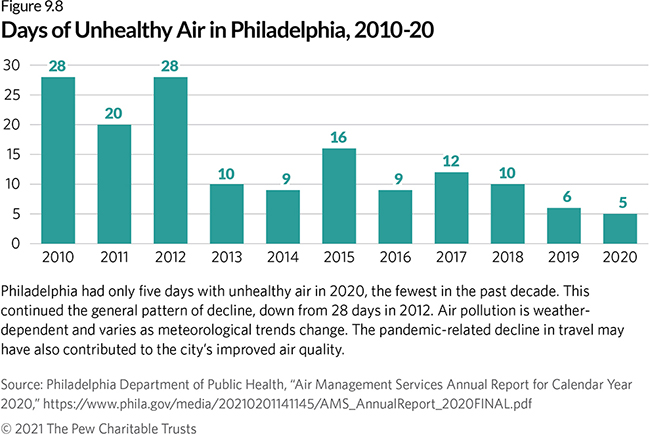This pandemic-related decline in travel may have also contributed to improved air quality; Philadelphia had only five days with unhealthy air in 2020, the fewest in the past decade and down sharply from 28 in 2012.