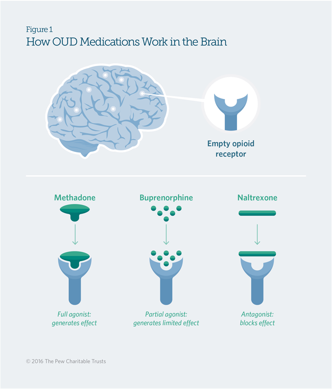 Receptors, which are found on human cells, are places where a drug or substance made by the body binds to either cause or block an effect. Methadone and buprenorphine are opioid agonists, meaning they activate or occupy the mu-opioid receptor, the same one activated by heroin.