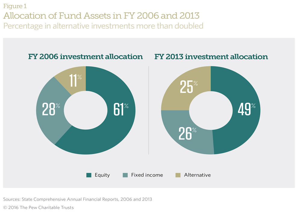 State retirement systems across the United States collectively have more than $3 trillion in assets, with threequarters invested in stocks and what are known as “alternative investments”—an allocation that has more than doubled in recent years.2 To manage these assets, state funds paid more than $10 billion in 2014 in fees and investment expenses—their largest expenditure. The cost of managing these assets has increased by more than 30 percent over the past decade, a jump closely correlated with greater use of alternative investments, such as real estate, private equity, and hedge funds. These fees can reduce investment returns on alternatives by as much as 10 to 20 percent.