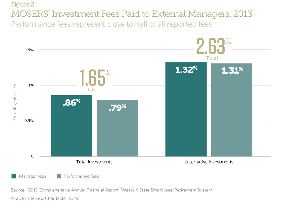 This level of fee disclosure may be uncommon, but South Carolina is not the only plan collecting and reporting more than invoiced fees. The Missouri State Employees’ Retirement System (MOSERS) is particularly thorough in collecting and reporting these fees, not only by asset class but for each external consultant or manager. MOSERS reports the highest fees of the 73 plans studied, at 1.73 percent, with 1.65 percent paid to external managers. But, as illustrated in Figure 2, about half of all reported external management costs during the 2013 reporting period were performance fees that many states do not report.