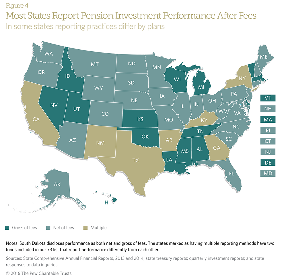 Some state funds report investment performance “gross of fees,” which does not account for payments to investment managers. Some provide information about overall long-term performance but do not detail the results of individual investment strategies. Some states, though, are taking action to improve transparency. After public criticism, state treasurers in North Carolina and Rhode Island took new steps over the past two years toward greater fee disclosure.3